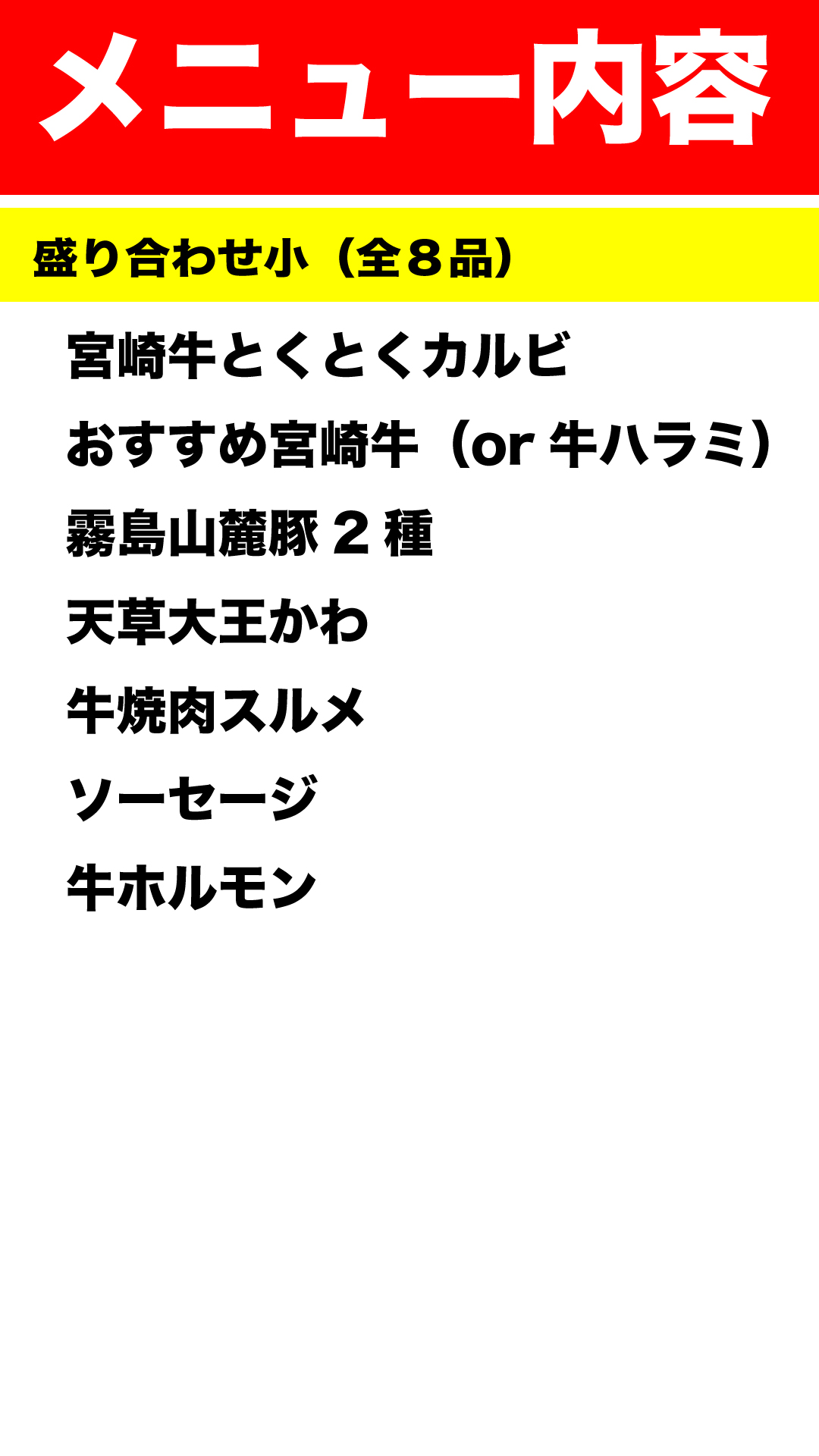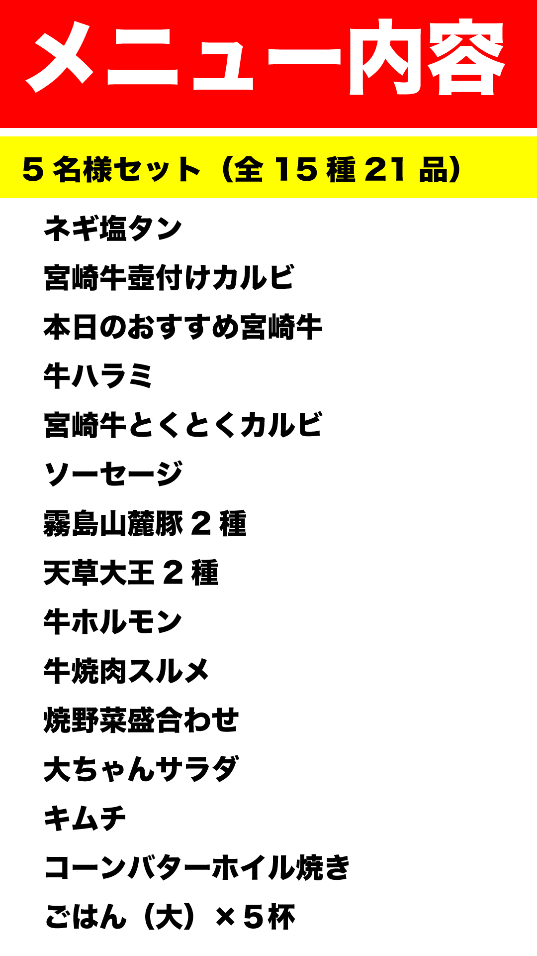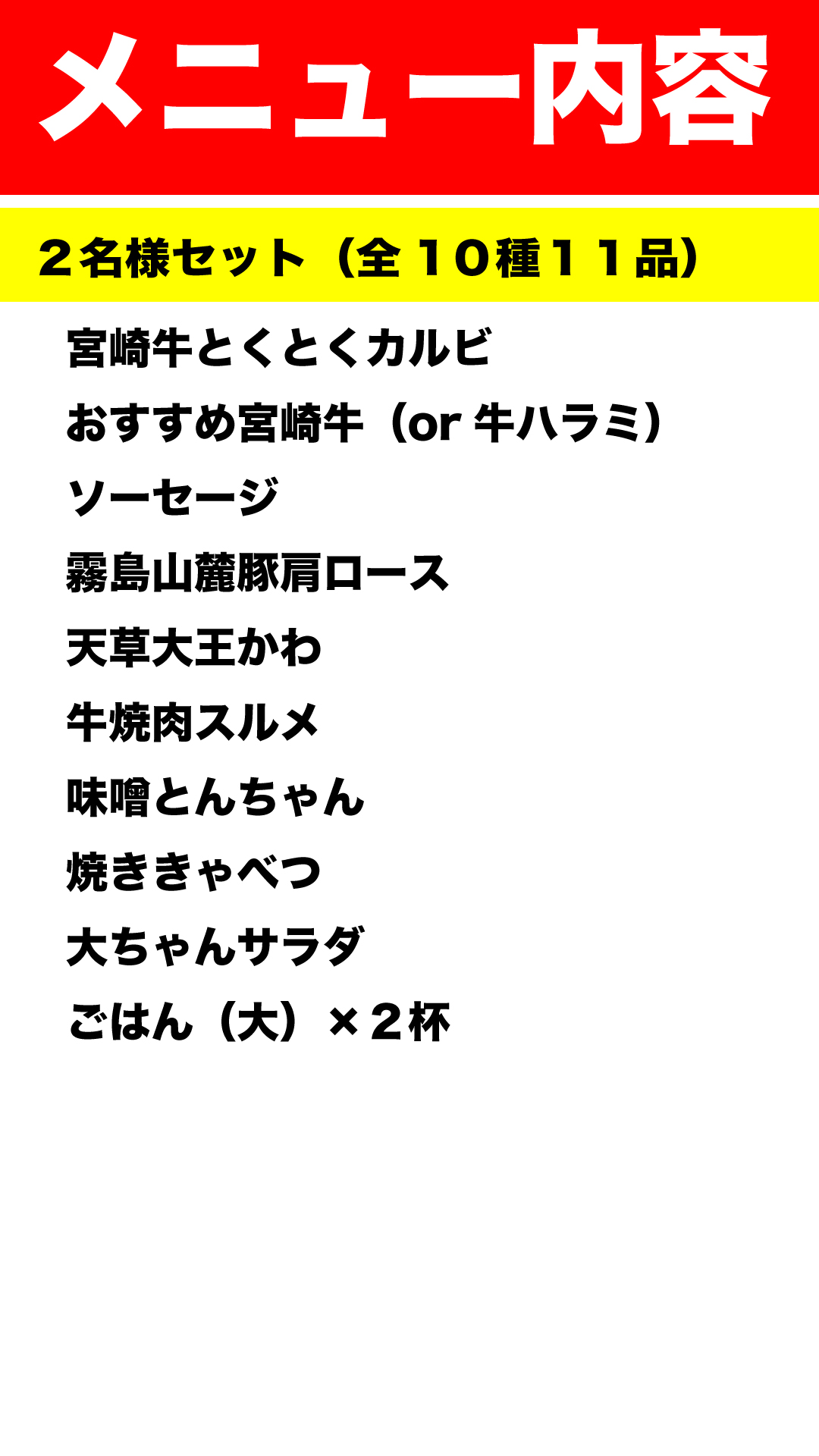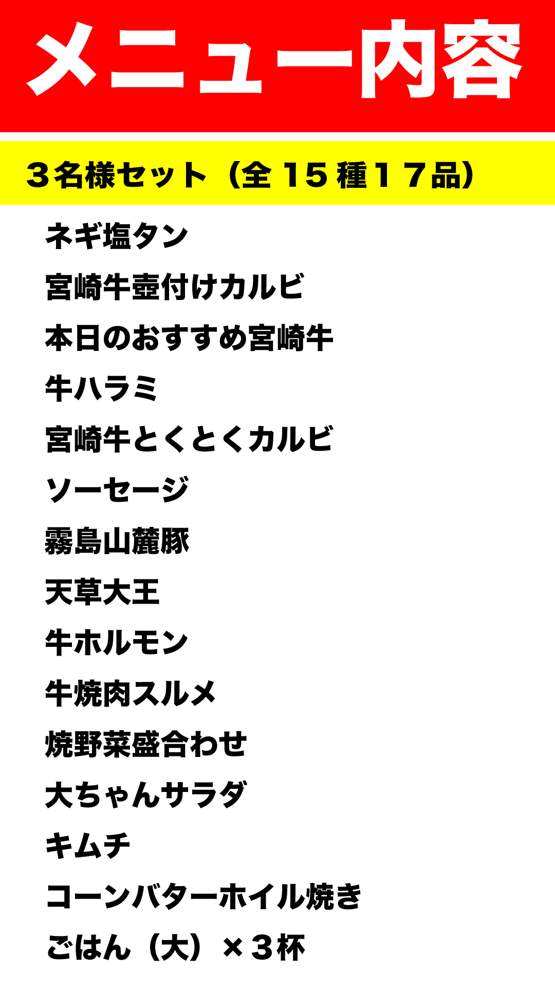 大ちゃんセット(全13種16品)=4名様向け=クーポン価格:9980円 【ボリューム満点!4名様向け】「しっかり焼肉を楽しみたい!」そんなご家族にぴったりのセット。宮崎牛の旨みはもちろん、ジューシーな天草大王、柔らかく甘みのある霧島山麓豚など、厳選されたお肉を贅沢に味わえます。多彩なラインナップで、みんなが満足できる内容です! メニュー表示 クーポン