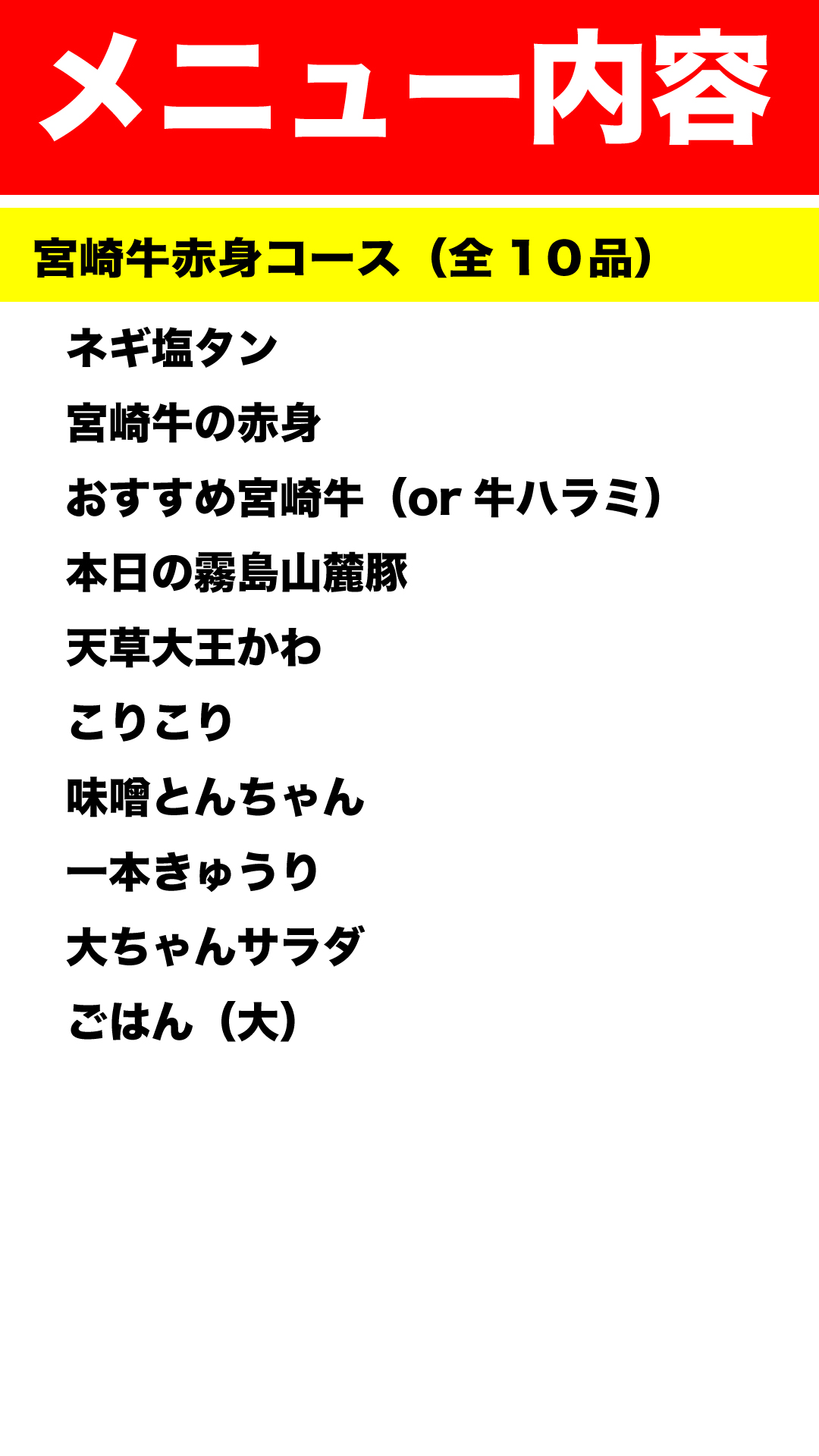 宮崎牛赤身コース(10品)+飲み放題 メニュー表示 1人前:5,260円(税込) 2人前〜でお願いします